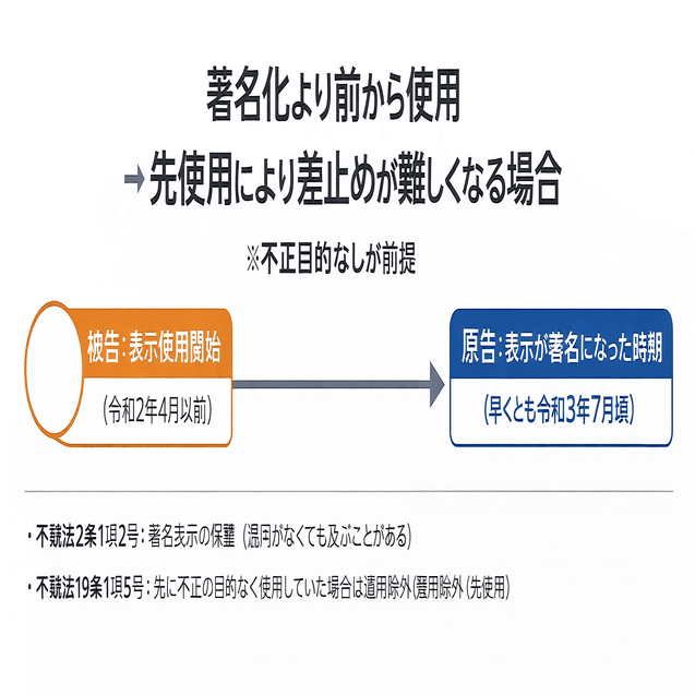 不正競争防止法(不競法)では、他人の「著名な表示」(広く知られた名称・ブランド等)を守る仕組みがあります。ところが、“今は著名”であることだけでは足りない場面があります。勝敗を分けるのは、(1)いつ著名になったのか、そして(2)相手がそれより前から不正目的なく使っていたのか(先使用)という時系列です。
