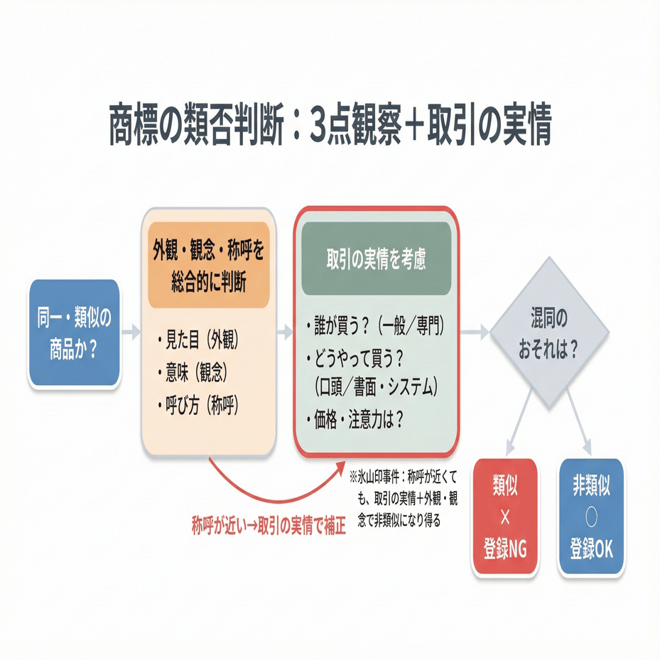これは、従来の「音が似ていれば原則アウト」という硬直的な運用に対し、「他の要素や取引の実態を見て、間違いようがないならセーフにしてよい」という柔軟な判断を許容するものです。