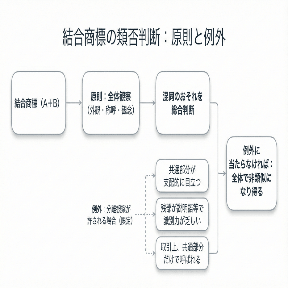 「うちは昔からこの言葉を使っている」「界隈では知られている」という事情があっても、他人の結合商標の一部を当然に支配するとまでは言い切れない場合がある、ということです。