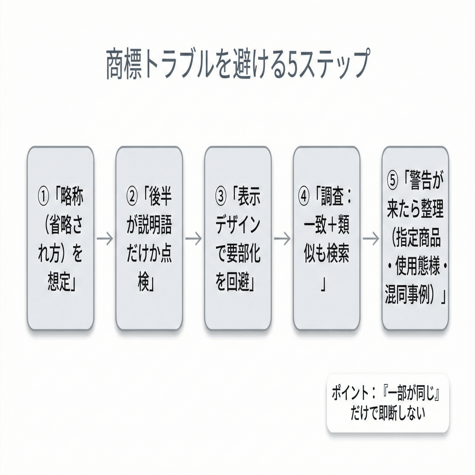 名前を決める段階で、略され方・説明語の弱さ・表示デザイン・調査範囲を一度だけ点検するだけで、トラブルの確率はかなり下がります。
