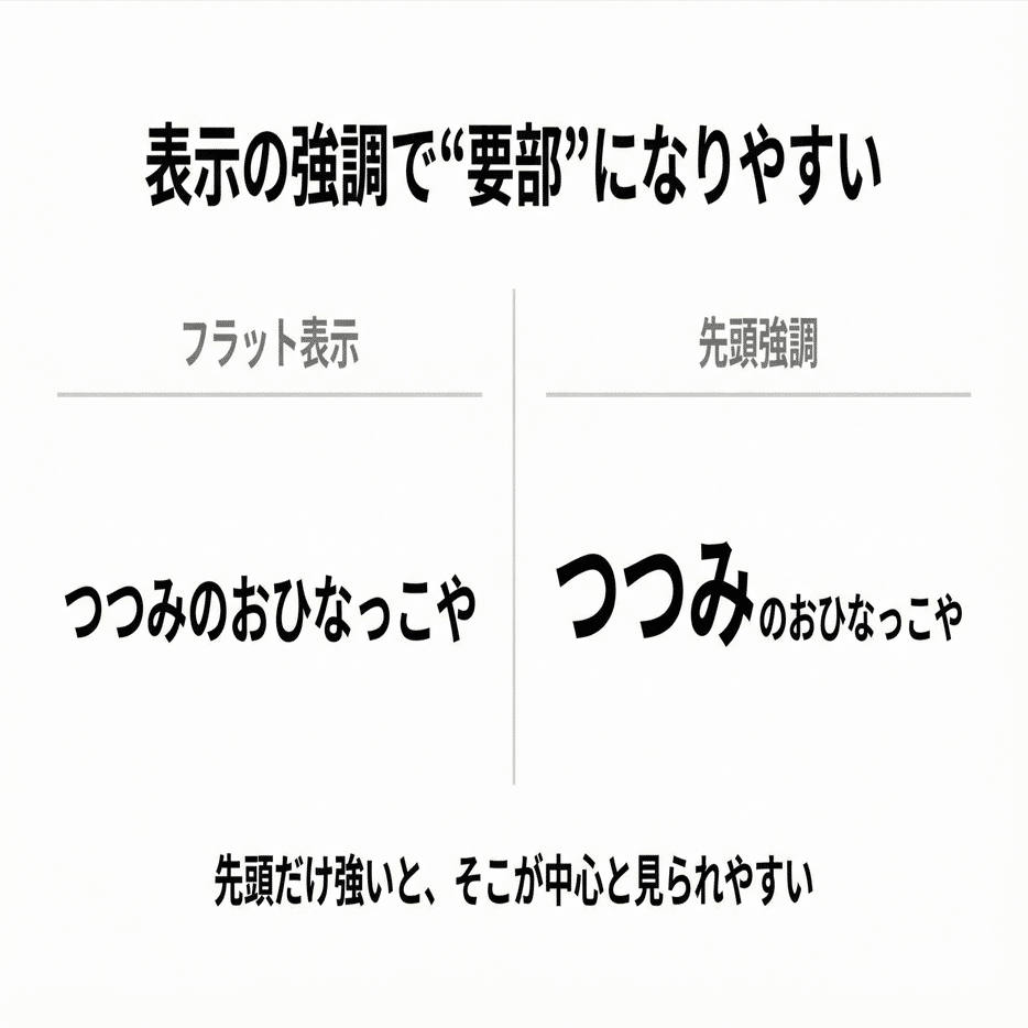先頭だけ大きく・太く・別色にすると、意図せず「そこが中心」と見られます。