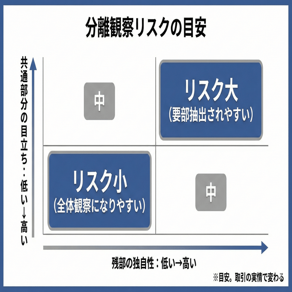 このような事情が重なると、「全体で違う」と言いにくくなり、要部抽出が起きやすくなります。
