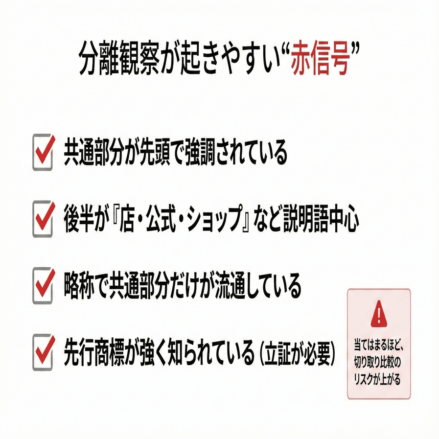 「後ろに“店”“本舗”“公式”“ショップ”を付けたから大丈夫」と考えがちですが、そうした語が“説明語”として扱われると、逆に「前半(共通部分)だけが要部」とされる危険があります。